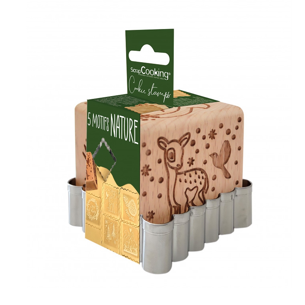 Cube embossoir en bois avec 5 motifs nature pour graver la pâte avant découpe avec un découpoir en acier inoxydable pour la réalisation de biscuits.