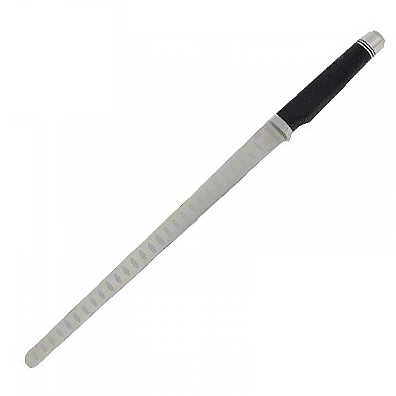 Lame inox alvéolée 30 cm. Longueur totale du couteau : 42,5 cm. Soie solide monobloc. Manche polymère et fibre de carbone. Système de contrepoids ajustable pour régler l'équilibre du couteau.