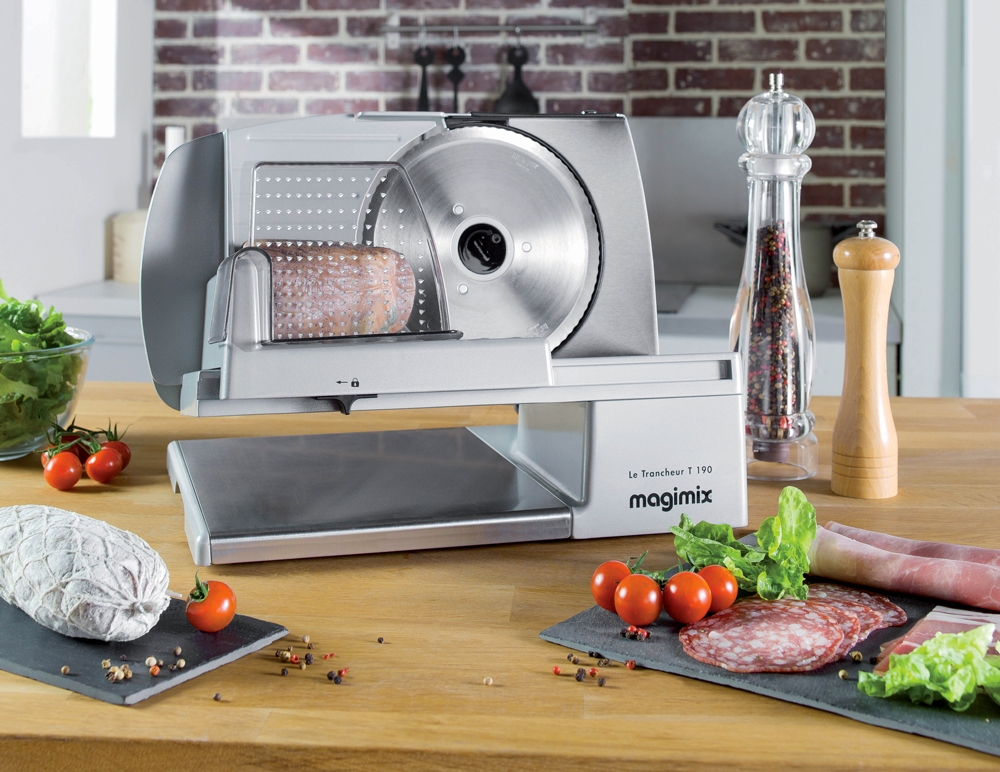 La trancheuse Magimix T 190 est multifonctions, elle permet de couper efficacement et facilement de la charcuterie comme du pain.