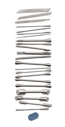Contient : 4 gouges striées. 6 gouges arrondies. 4 gouges à bords biseautées. 5 gouges doubles. 3 lames de découpe. 1 pierre à affûter.