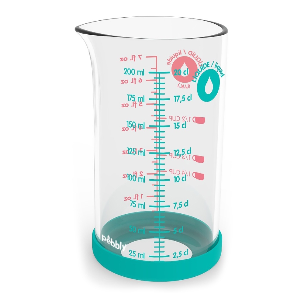 Le Verre Mesureur 200 ml Pebbly est très précis. Il est gradué en ml, cl, cup et fl.oz. Réalisé en verre borosilicate, il résiste à la chaleur jusqu'à 300°C et est muni d'une base antidérapante amovible.