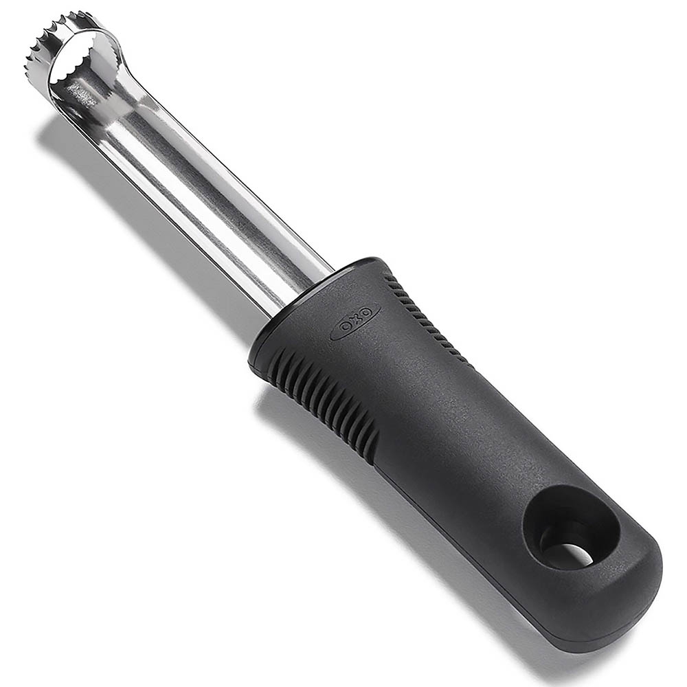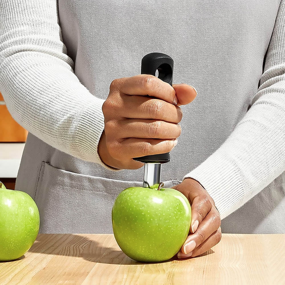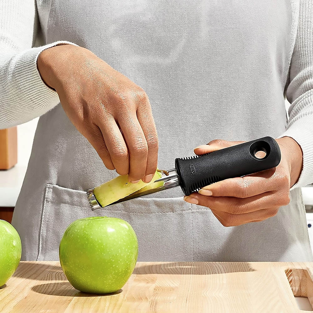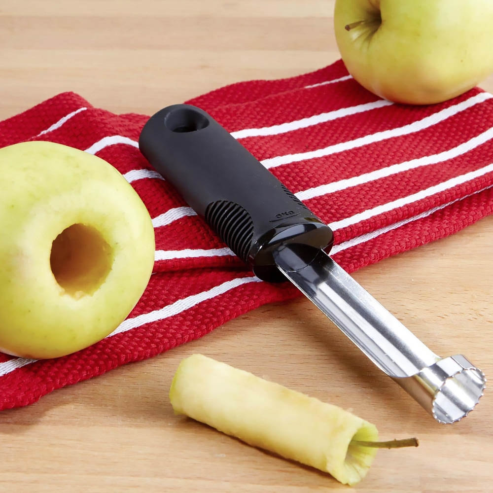 Le Vide Pomme Oxo permet d'un geste simple et rapide de retirer le trognon des fruits (pommes, poires...) pour les déguster en quartiers ou pour préparer des compotes, tartes ... Réalisée en acier inoxydable, sa lame est dentelée et finement acérée pour être insérée dans les fruits sans les abîmer. Il suffit de l'introduire dans le fruit en tournant l'ustensile pour en retirer le coeur. Il possède un manche ergonomique anti-dérapant.